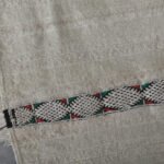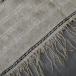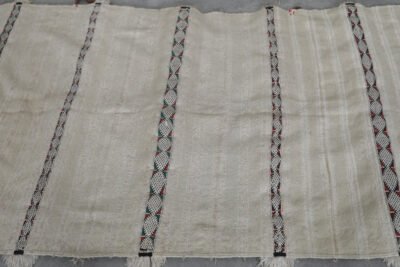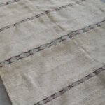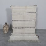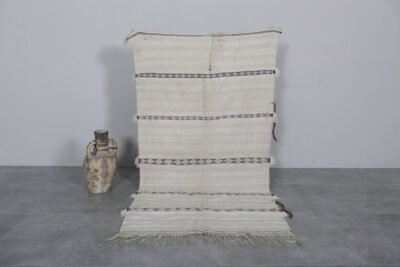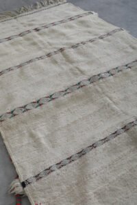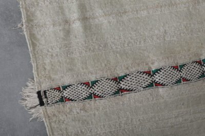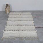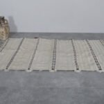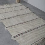 Bring timeless Moroccan artistry into your home with this handmade flatwoven carpet. Crafted from natural ivory wool and detailed with subtle linear patterns, it beautifully reimagines the elegance of traditional Moroccan wedding blankets in a light and versatile rug format.