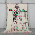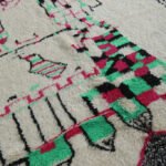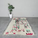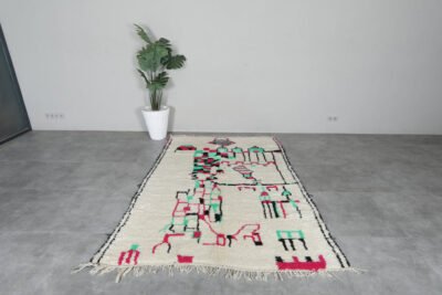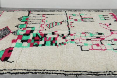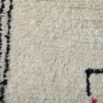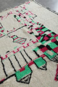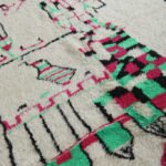 Infuse your home with the charm of Moroccan craftsmanship with this stunning Azilal wool rug. Its creamy ivory base is brought to life with playful black motifs—arrows, diamonds, and scattered tribal lines—that create an organic, story-rich design. The freeform layout adds a spontaneous, expressive touch, while the soft wool provides warmth and comfort underfoot.