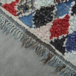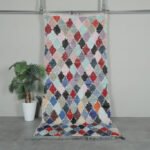 Handwoven by skilled Moroccan artisans, this Boucherouite rug features a powerful diamond motif in a striking color palette, crafted from recycled wool and fabric scraps. Its plush, textured surface brings warmth and vibrancy to any room, reflecting authentic Moroccan creativity and heritage.