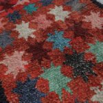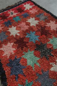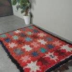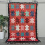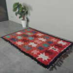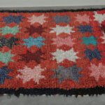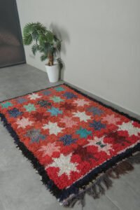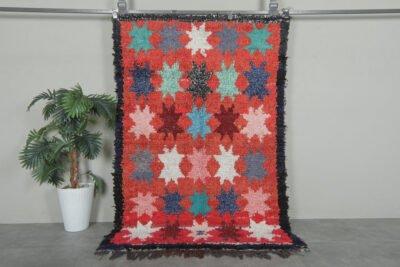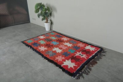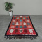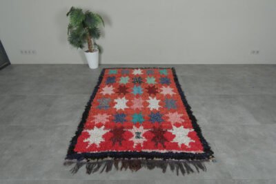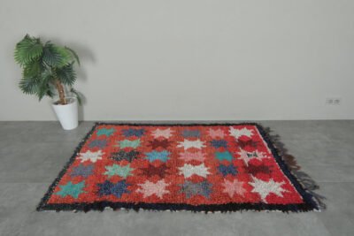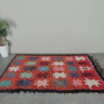 Red vintage Moroccan boucherouite rug with star motifs – 4.1 ft x 6.2 ft