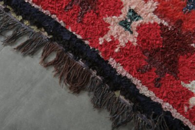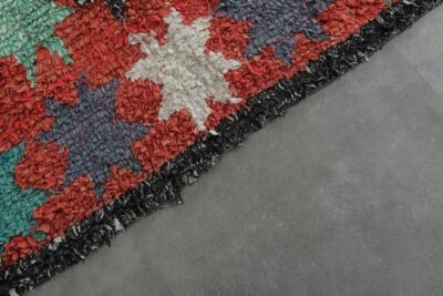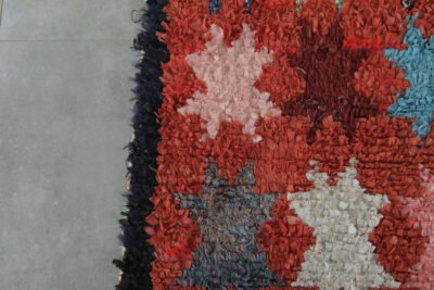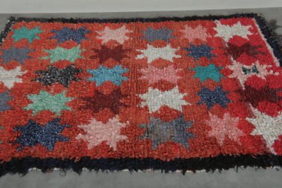 Brighten your space with the bold character of this vintage Moroccan Boucherouite rug. Handwoven by skilled artisans, it features a fiery red base adorned with multicolored star motifs in soft pink, ivory, green, and sky blue. The playful, free-form horizontal patterns and subtle white borders reflect the spirit of Berber artistry, while recycled textiles create a soft, textured surface full of character.